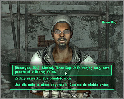 안전할 때 Sarah Lyons 와 다시 이야기할 수 있습니다. 그러면 그녀는 당신이 슈퍼뮤턴트 를 물리치는 데 한 모든 도움에 대해 감사할 것 입니다. 큰 건물을 향해 진행합니다. 인터콤을 사용하고 잠시 후 라디오 방송국에 액세스할 수 있습니다. 원한다면 건물 전체를 둘러볼 수 있으며 현재의 형제 자매들 과 대화할 수도 있습니다 . 현재 챌린지를 완료하려면 계단을 사용하여 1층으로 이동해야 합니다. RGN Studios 로 연결되는 단일 문을 찾으십시오 . 당신이 이야기해야 할 사람은 Three Dog 입니다. 제임스 가 어디에 있는지 말하도록 설득할 수 있습니다.(화면)이(가) 갔지만 이 도전에 성공하려면 높은 연설 가치가 있어야 합니다. 그에게 호의를 베푸는 데 동의할 수도 있습니다. 트랜스미터와 수리 방법에 대해 알아봅니다. 다음 메인 퀘스트 설명으로 넘어갑니다.