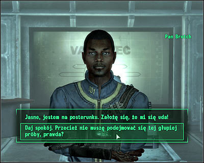 결국 당신은 GOAT가 일어날 지역에 도착해야 할 것입니다. 거기 미스터 브로치와 대화하십시오 . 시험(화면)을 건너뛰는 데 도움을 제공하도록 그를 설득하거나 모범 학생이 되어 시험 응시에 동의할 수 있습니다. 테스트를 시작하기로 결정했다면 빈 책상을 찾아야 합니다. 앉아서 열 가지(글쎄... 아홉 ;-)) 질문에 답하십시오. 테스트가 끝나면 Brotch 로 돌아가 결과를 확인하십시오. 귀하의 답변에 따라 Brotch 는 귀하를 위해 전문 분야를 선택하지만 귀하는 그의 권장 사항을 무시하고 스스로 세 가지 기술을 선택할 수 있습니다. 또한 Vault 101 을 떠나기 전에 결정을 변경할 수 있기 때문에 주요 특성과 유사할 것입니다.. 방을 나가면 이 퀘스트가 완료됩니다.