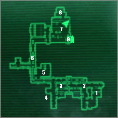 지도 범례: 1 - 시작 지역; 2 - 첫 번째 가드; 3 - 부치; 4 - 부치의 어머니; 5 - 식당; 6 - 고메즈 장교; 7 - 의무실; 8 - 소규모 사무실; 9 - 출구: Vault 101 - 아트리움