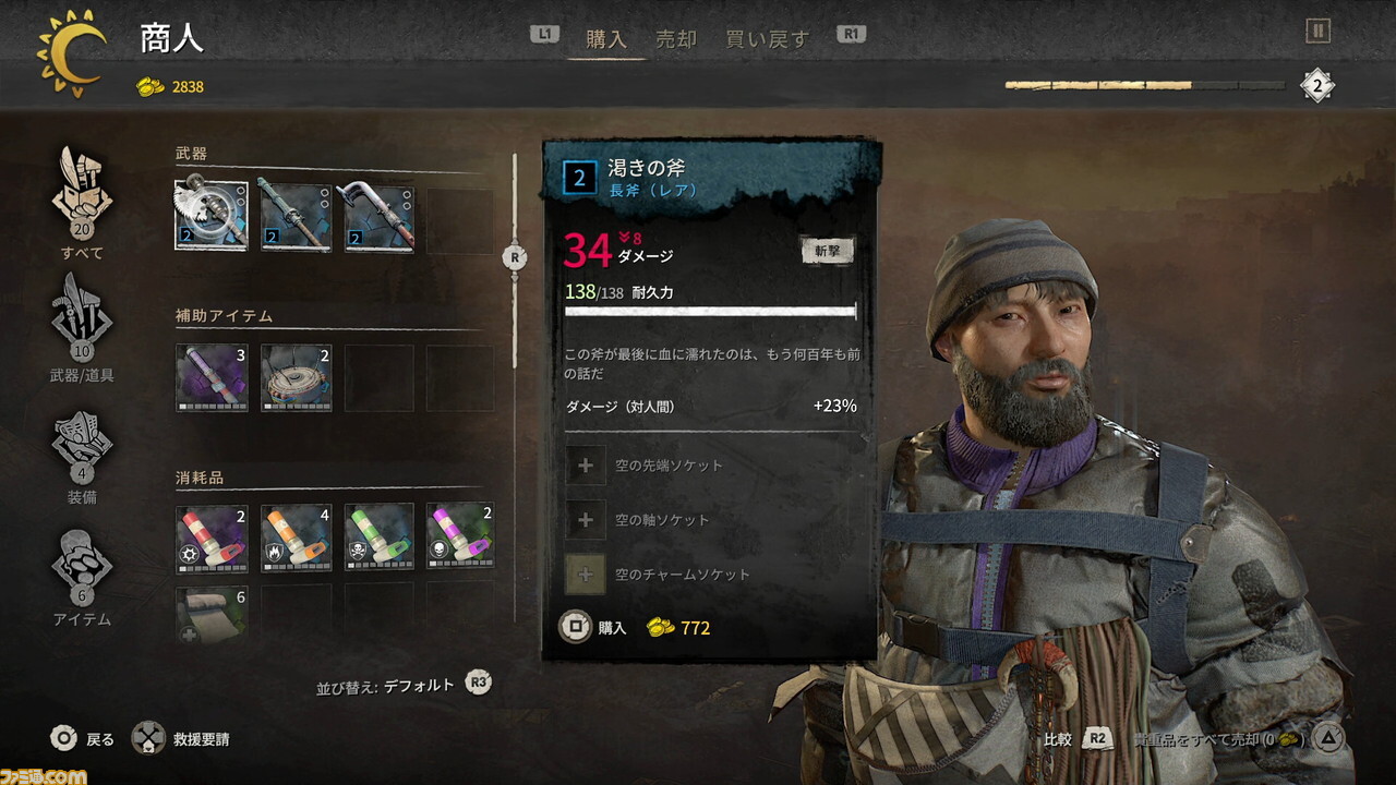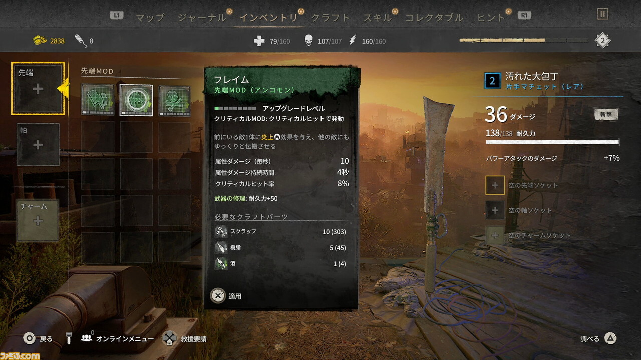 이 개조가 꽤 강력하고, 본작을 진행하는데 꽤 의지할 수 있는 시스템이라고 느꼈다. 개조하면 다양한 부가 효과를 무기에 부여할 수 있다. 초반에 이용할 수 있는 것은, 불속 속성, 번개 속성, 독 속성 등. 이 중 효과를 알기 쉽게 실감할 수 있는 것이 불길 속성이다.