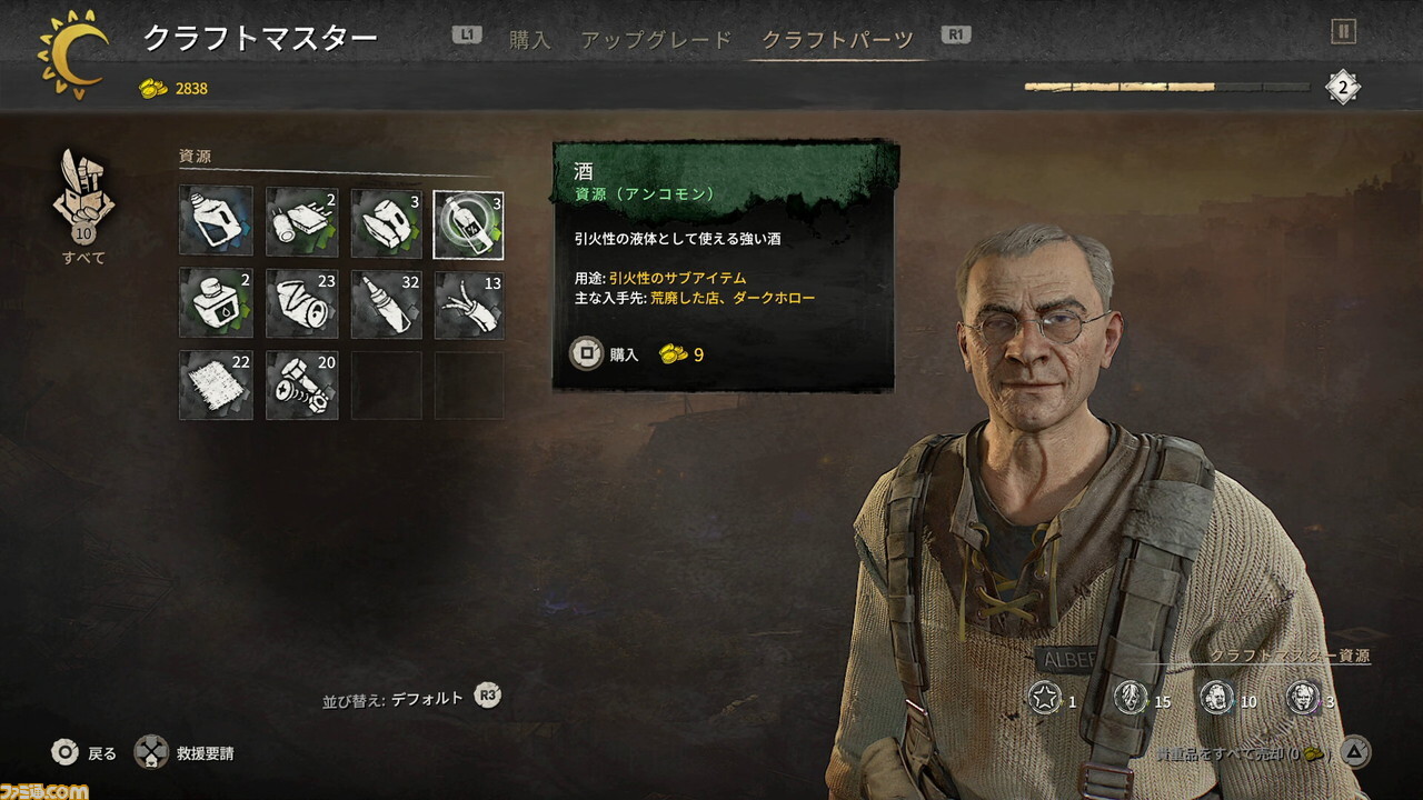 술은 플레임 개조에도 사용하기 때문에 꽤 소비가 심한 인상이다. 거점으로 돌아왔을 때 가게의 가게 주인이나 크래프트 마스터에게 말을 걸어, 술이 팔고 있으면 반드시 구입하고 싶다.