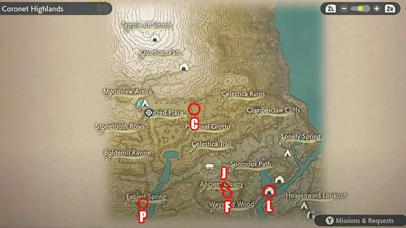 - Coronet Highlands에서 Ancient Quarry로 가서 Alpha Goodra 를 찾으십시오 . 지도의 갈색 원 근처에 있습니다. 포켓몬 뒤에 있는 바위를 올려다 보세요.