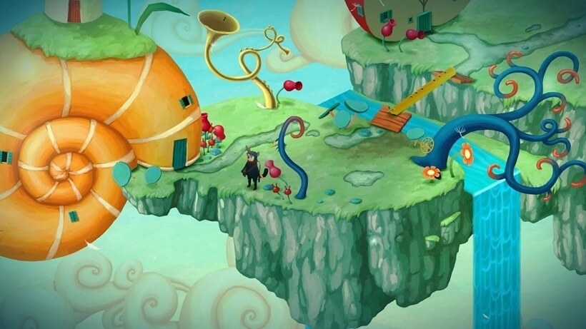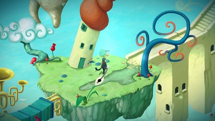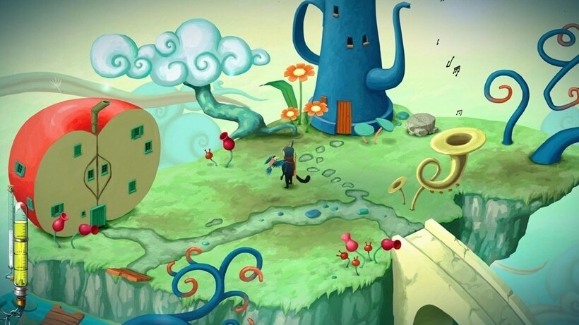 황동 다리로 돌아가서 그 안에 있는 트럼펫 피스톤을 사용하십시오. 한 번 더 가십시오. 다리 아래에서 오른쪽 길로 가십시오. 파란색 풍차의 핸들을 두 번 돌립니다. 빨간 풍차의 손잡이를 세 번 돌립니다. 파란색 풍차로 돌아가서 핸들을 다시 세 번 돌립니다. 기타 식물이 있는 섬에는 나무에 꽂힌 손잡이가 있습니다. 칼로 손잡이 를 쳐서 집어 올리십시오. 일단 땅에 구멍이 있는 섬은 무시하세요.