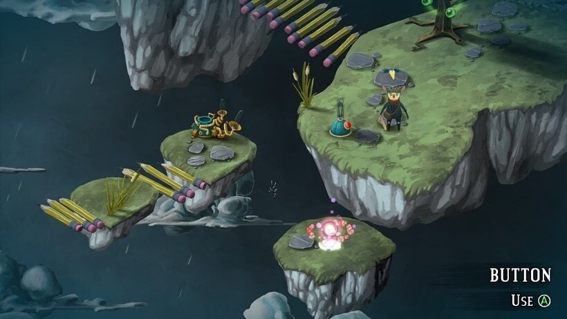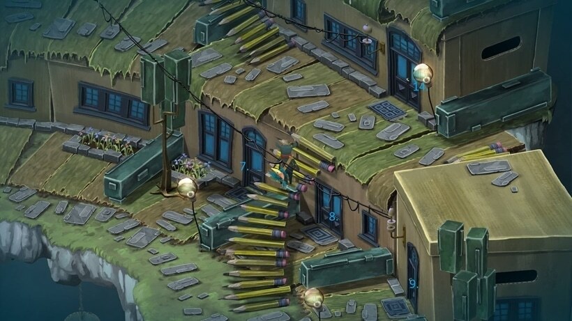 바닥에 있는 길을 무시하고 건물을 지나 두 번 발로 차야 하는 스위치로 올라가십시오. 연필 다리를 건너 다음 스위치에 접근합니다. 두 개의 촉수에게 공격을 받게 됩니다. 두 개의 별개의 적임에도 불구하고 그들은 건강 측정기를 공유하므로 하나를 죽이면 둘 다 죽습니다. 그들의 엔돌핀을 모은 다음 스위치를 두 번 걷어차십시오. 연필 다리를 건너 파란색 배터리 를 수집합니다 . 스위치로 돌아가서 다시 두 번 발로 차십시오. 연필 다리를 건너 배터리 소켓에 파란색 배터리를 넣습니다. 연필 다리를 건너 다른 스위치에 도달하십시오. 파이퍼는 게임의 첫 번째 기억을 발견할 것입니다.
