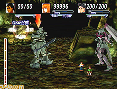 배틀에서는 약, 중, 강의 공격 버튼을 누르는 순서로 낼 수 있는 필살기가 변화. 장면에 따라서는 "기어"라고 불리는 거대한 인형 무기에 탑승하여 전투와 던전을 탐색하는 것이 '제노기아스'만의 특징. 등장하는 다양한 기어에 매료되는 유저도 많이 있었던 것은 아닐까.
