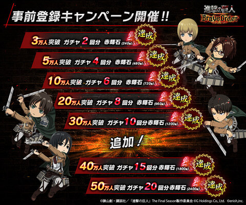 enish는 Android/iOS용 다인원 공투형 RPG 「진격의 거인 Brave Order」의 전달을 오늘 2월 11일에 개시한다. 기본 플레이 무료로 비즈니스 모델은 아이템 과금제.