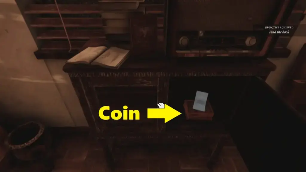 - 동전 찾기: 동전은 책장 옆 나무 받침대 안에 있습니다.