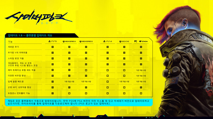 이번 패치에는 게임의 다양한 개선 사항, 다수의 퀘스트와 게임 플레이 수정 사항, 무료 DLC가 포함돼 있습니다. 무엇보다 차세대 업데이트를 통해, 사이버펑크 2077이 XBOX SERIES X|S와 PlayStation®5의 향상된 하드웨어 성능을 이용할 수 있게 될 것입니다.