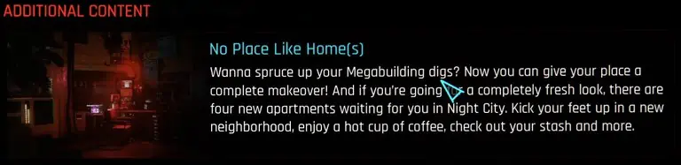 Cyberpunk 2077 패치 1.5에서는 Megabuilding H10에서 원래 아파트를 개조할 수 있습니다. 6개의 리노베이션이 가능합니다. 각각의 비용은 10,000 Eddies입니다.