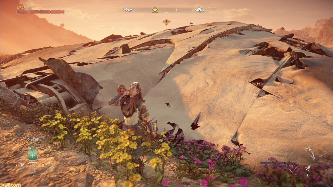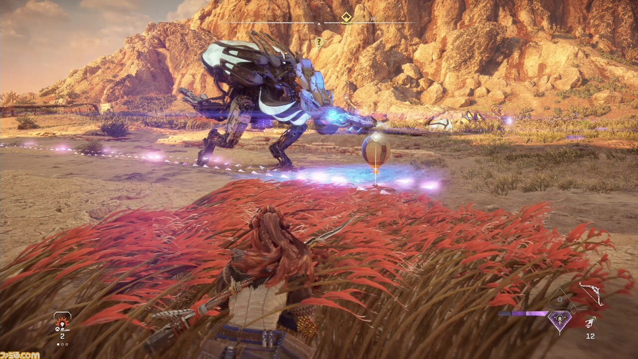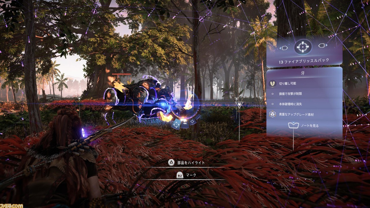 전작과 마찬가지로 본작에서도 1000년 전의 장치·포커스를 활용하는 것은 플레이의 기본이다. R3 버튼을 눌러 포커스를 기동하고, 기계 짐승을 스캔하면, 약점이 되는 부위나 속성을 특정할 수 있다.