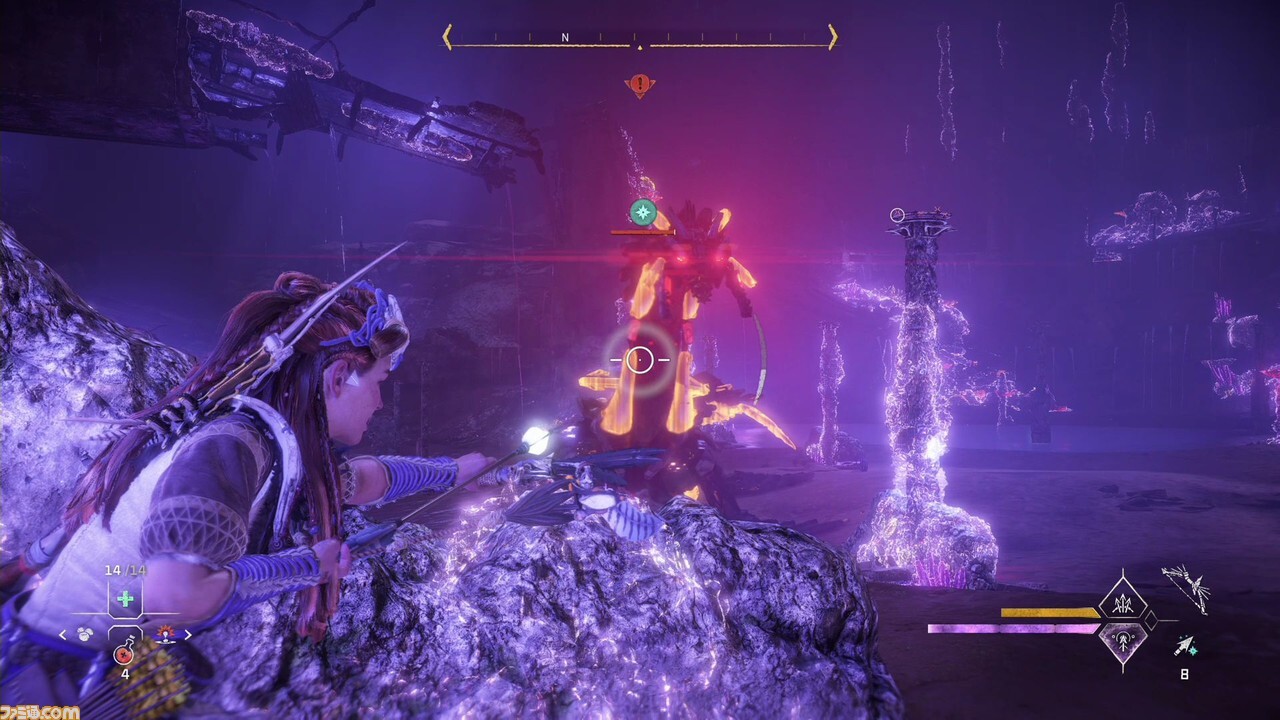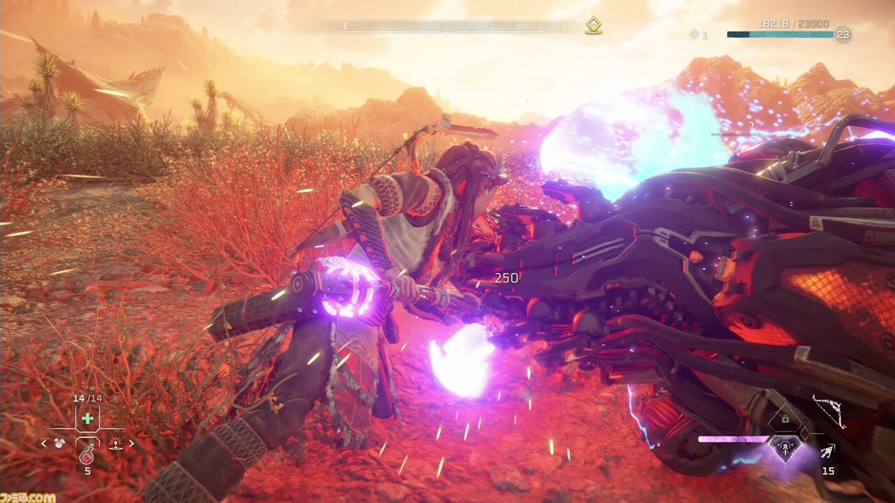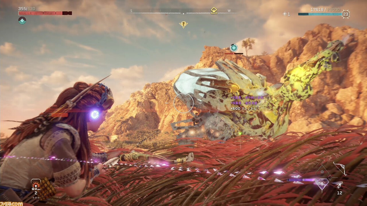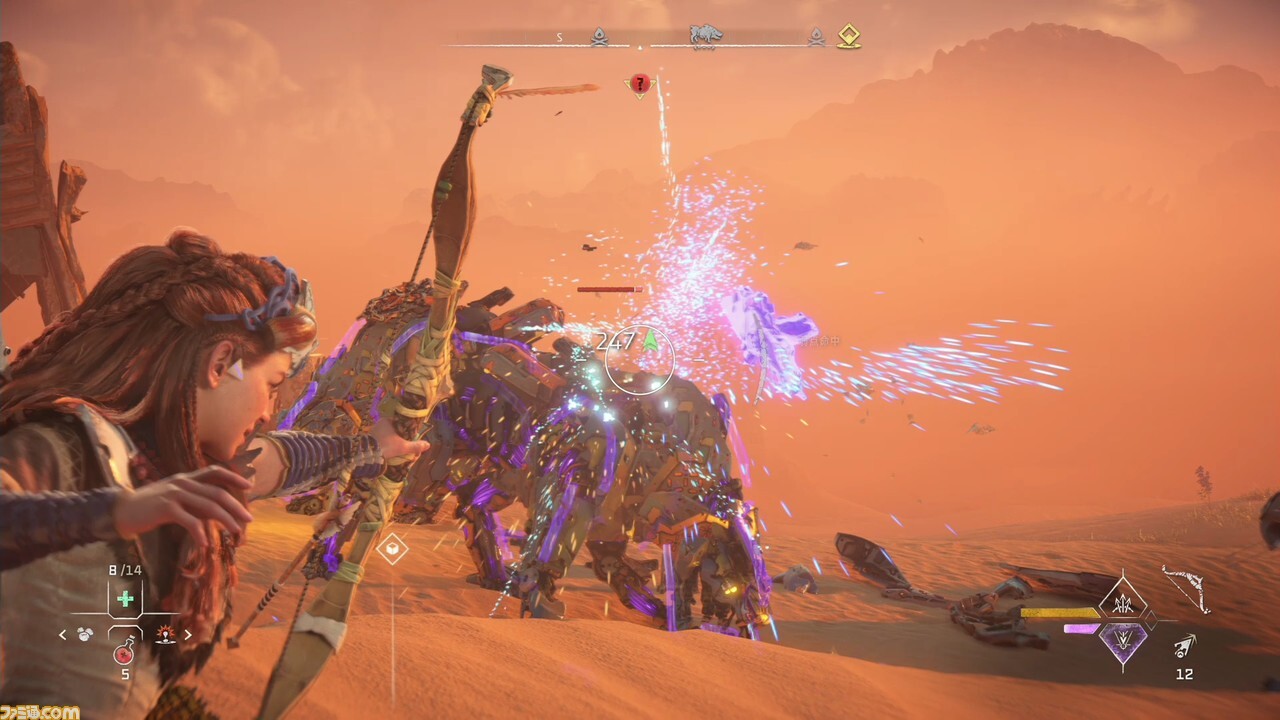 전작과 마찬가지로 본작에서도 1000년 전의 장치·포커스를 활용하는 것은 플레이의 기본이다. R3 버튼을 눌러 포커스를 기동하고, 기계 짐승을 스캔하면, 약점이 되는 부위나 속성을 특정할 수 있다.