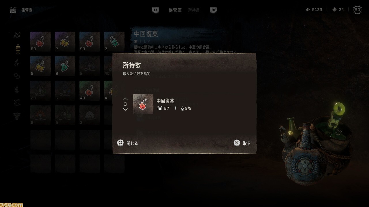 입수한 아이템이 상한을 넘으면, 거리나 야영지 등에 설치되어 있는 보관고에 자동적으로 보내져, 관리되게 된 것도 중요한 변경점의 하나. 짐의 넘치는 것을 신경쓰지 않고 소재를 채취할 수 있지만, 운반할 수 있는 자원의 양이 적어졌기 때문에, 화살이나 약용 식물의 이용은 계획적으로. 정기적으로 보관고에 들러 소재를 보충하자. 보관고에는 더 이상 사용하지 않는 장비를 맡길 수도 있다.
