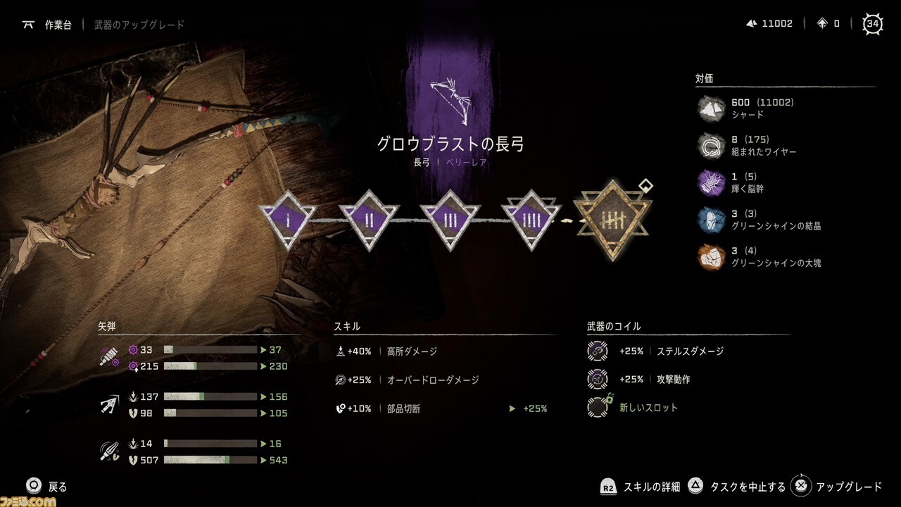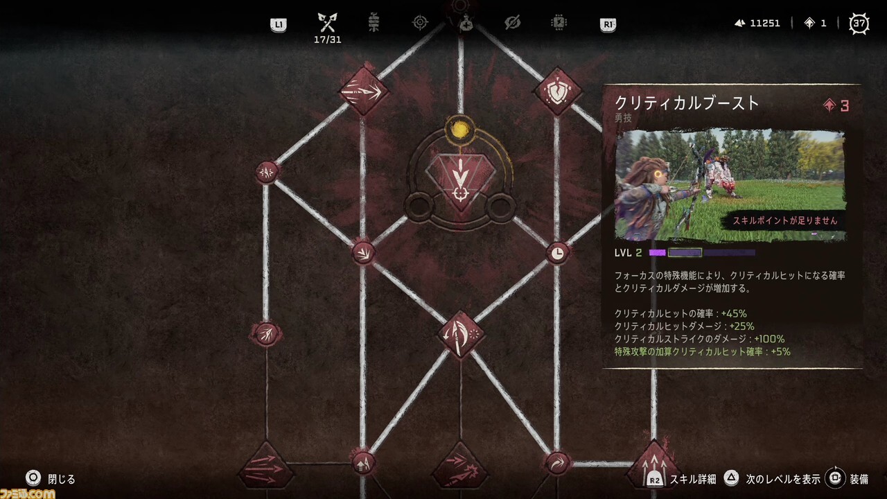 스킬트리를 해방해 가면, 알로이가 특수 공격을 사용 가능하게 된다. 특수 공격은 무기 스태미나를 소비해 내는 특별한 액션으로 무기마다 복수 준비되어 있다. 애용하고 있는 무기의 특수 공격을 우선해 습득해 나가면 좋지만, 사용 빈도가 높은 사냥꾼의 활이나 장궁의 특수 공격은, 다른 무기보다 우선도가 높아진다. 전자는 사냥꾼, 후자는 은밀한 스킬 트리에서 기억되기 때문에, 빠른 습득을 목표로 하자.