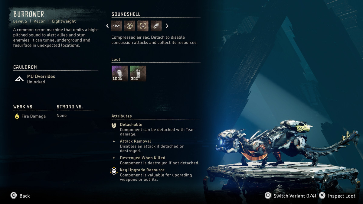 - 찢어진 손상 이 있는 기계에서 부품을 분리 하면 몇 가지 일을 할 수 있습니다. 체력의 큰 덩어리를 제거하고, 귀중한 업그레이드 재료를 얻고, 때로는 싸우고 있는 기계에 대항할 무거운 무기를 얻습니다. 많은 경우 분리된 구성 요소에서 얻을 수 있는 리소스는 먼저 분리하지 않고 기계가 죽으면 사라집니다.