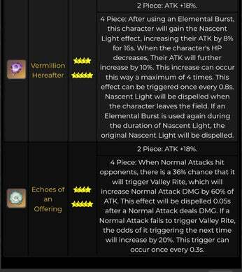 Vermillion Hereafter 의 2피스 보너스는 캐릭터의 공격력을 18%만큼 증가시키는 반면, 4피스 보너스는 다음과 같은 효과를 부여합니다. 16초 동안 % 캐릭터의 HP가 감소하면 공격력이 추가로 10% 증가합니다. 이 증가는 최대 4번까지 발생할 수 있습니다. 이 효과는 0, 8초마다 한 번만 활성화됩니다. 초기의 빛 보너스는 캐릭터가 땅을 떠납니다. Nascent Light가 활성화된 상태에서 엘리멘탈 버스트를 다시 사용하면 두 번째 라이트를 무시합니다."