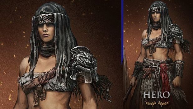 게임 내 설명: "집에서 전투용 도끼를 들고 황무지 족장의 후손인 충실한 영웅입니다."