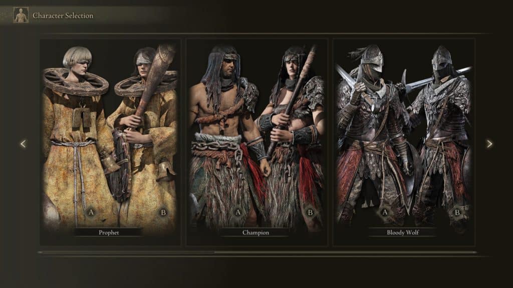 Prophet은 Spear, Finger Seal, Rickety Shield, Prophet Blindfold, Prophet Robe, Prophet Trousers, Heal(주문) 및 Beast Claw(주문)를 포함한 다양한 장비로 시작합니다.
