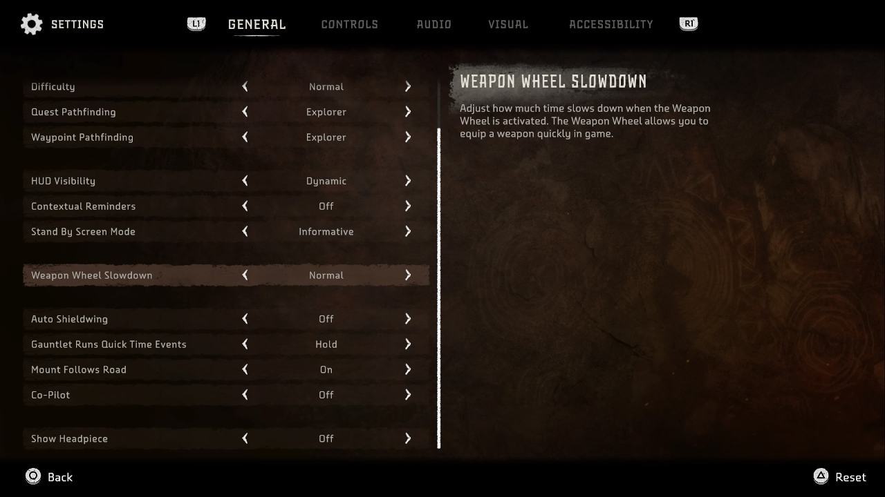Concentration in Horizon Forbidden West의 멋진 점은 실제로 옵션 메뉴에 사용자 정의 옵션이 있다는 것입니다. 게임에서 제작이나 기타 작업에 조금 더 시간을 들이고 싶다면 메뉴를 열고 설정을 변경하여 사물이 움직이는 속도를 늦추십시오.