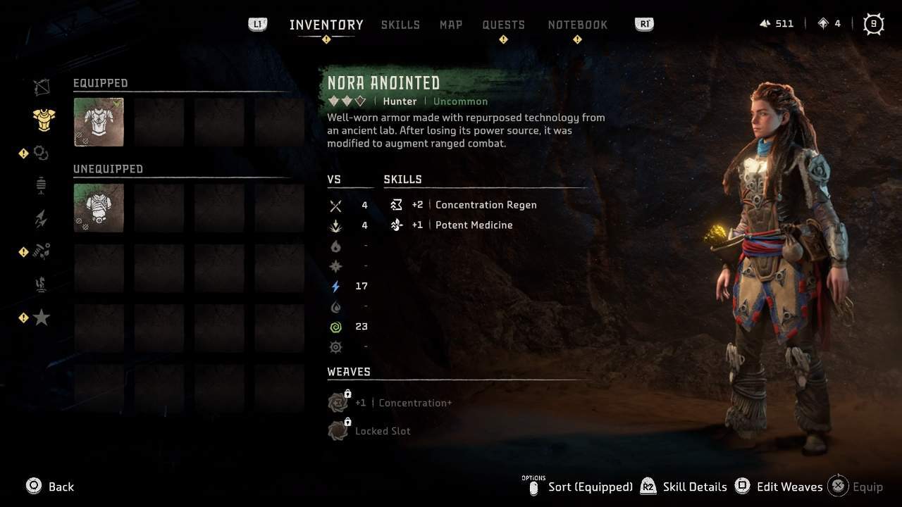 다양한 능력치 효과를 가진 동일한 무기를 여러 개 보유하는 것은 여러 유형의 적과 대면하는 전투에서 매우 중요합니다. Aloy는 한 번에 너무 많은 무기만 휴대할 수 있으므로 전투에 참여하기 전에 무기 휠에서 사용할 수 있는 무기를 관리해야 한다는 점을 명심하십시오.