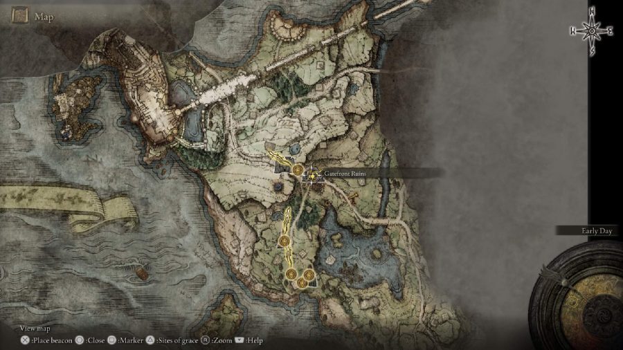 대부분의 플레이어가 처음으로 발견하는 지도 위치는 Limgrave West Map Fragment입니다. 그것은 Agheel Lake 및 Elleh 교회와 같은 주요 개방 지역에서 정북쪽으로 향하는 Gatefront Ruins 바로 옆에 위치하고 있습니다.