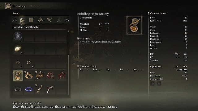 이것은 Furlcalling Finger Remedy (x1 Remedy를 위한 x2 Erdleaf 꽃) 의 제작법 에 접근할 수 있게 해줍니다. 이 아이템을 사용하여 PvP 및 협동 멀티플레이어 소환 신호를 표시하세요.