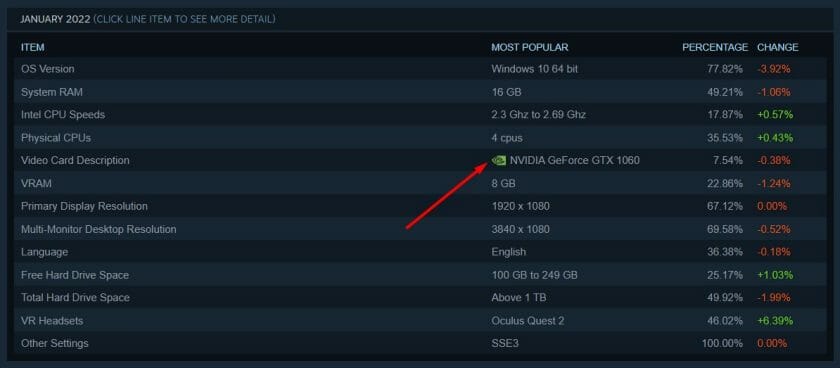 와, 이 시스템 요구 사항을 보세요. 이 게임을 실행하려면 확실히 강력한 컴퓨터가 필요합니다. Steam의 하드웨어 설문조사 를 보면 GTX 1060이 여전히 가장 인기 있는 GPU라는 것을 알 수 있습니다.