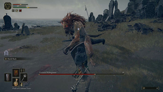 다른 보스 싸움 경기장과 마찬가지로(당신이 Margit과 Godrick을 바라보고 있음), Leonine Misbegotten과 싸우는 동안 경기장 중앙에 머무르기 위해 조심해야 합니다. 왜냐하면 경기장 가장자리에서 벗어나면 즉각적인 죽음이 당신을 기다리고 있기 때문입니다. 다른 싸움과 달리 가장자리가 모두 물이기 때문에 가장자리가 어디에 있는지 말하기가 어렵습니다.