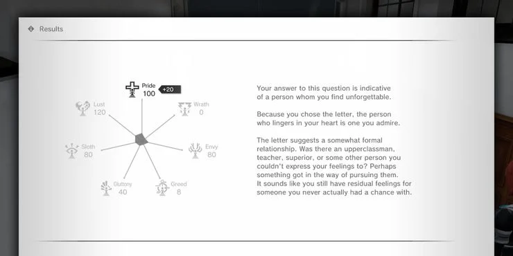 심리 테스트를 받는 것은 당신의 대답에 따라 당신의 자아 중 하나를 상당한 양으로 향상시킬 것입니다. 한 번의 전투를 치른 후에 새로운 테스트를 볼 수 있으므로 전투를 완료하고 테스트를 수행한 다음 프로세스를 반복하여 이 학생들에게 접근하면 모든 심리 테스트를 갈고 닦을 수 있습니다.