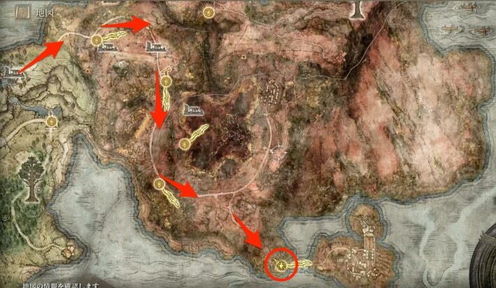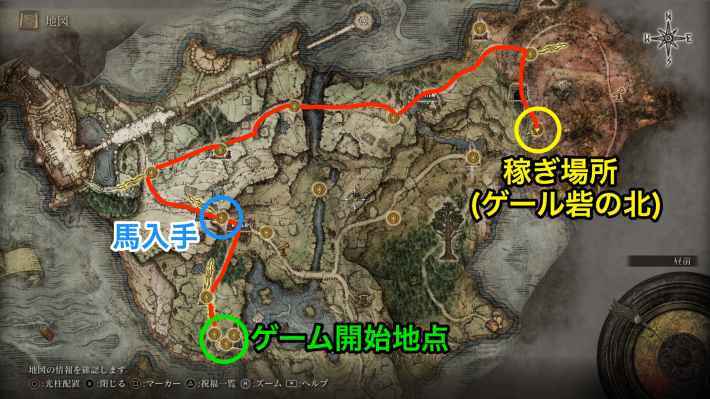 이 벌이 방법은 말이 필수이므로, 「게일 요새의 북쪽」까지 향하는 길의 「칸몬 앞」에 있는 축복을 접해 말을 입수 하자. 입수하면 이미지의 루트 거리로 진행하면 목적지에 도착한다. 이미 말을 가지고 있고 축복 '게일 요새의 북쪽'을 해방하고 있는 사람은 워프로 이동해 OK다.