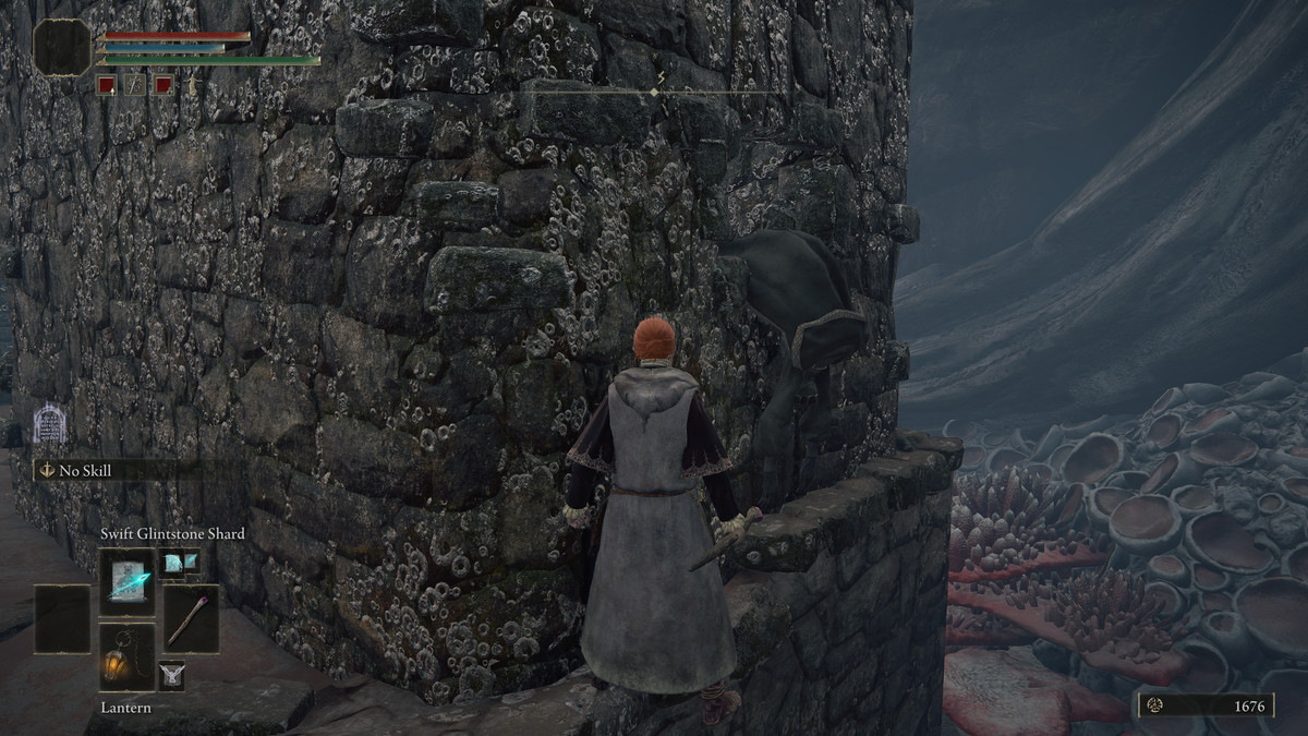 타워의 뒷면에는 창문에 매달려 있는 시체가 있습니다. 당신은 그것의 바깥쪽을 둘러싸고 몸에 있는 아이템인 운석 지팡이 를 잡을 수 있어야 합니다 :