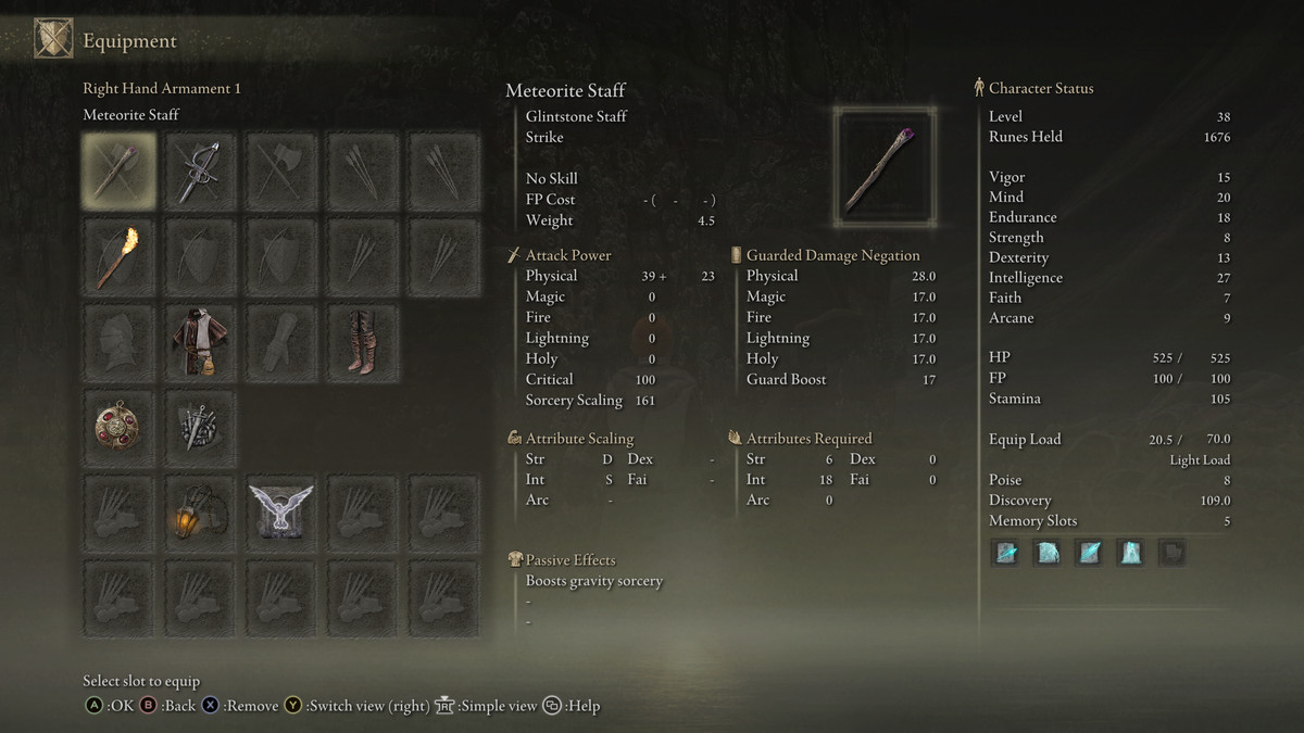 운석 지팡이는 지능이 있는 S 등급 스케일링 과 매우 높은 마법 스케일링을 가지고 있습니다. 즉, 지능에 투자하는 모든 포인트는 스케일링이 나쁜 지팡이보다 더 많은 피해를 입게 됩니다.