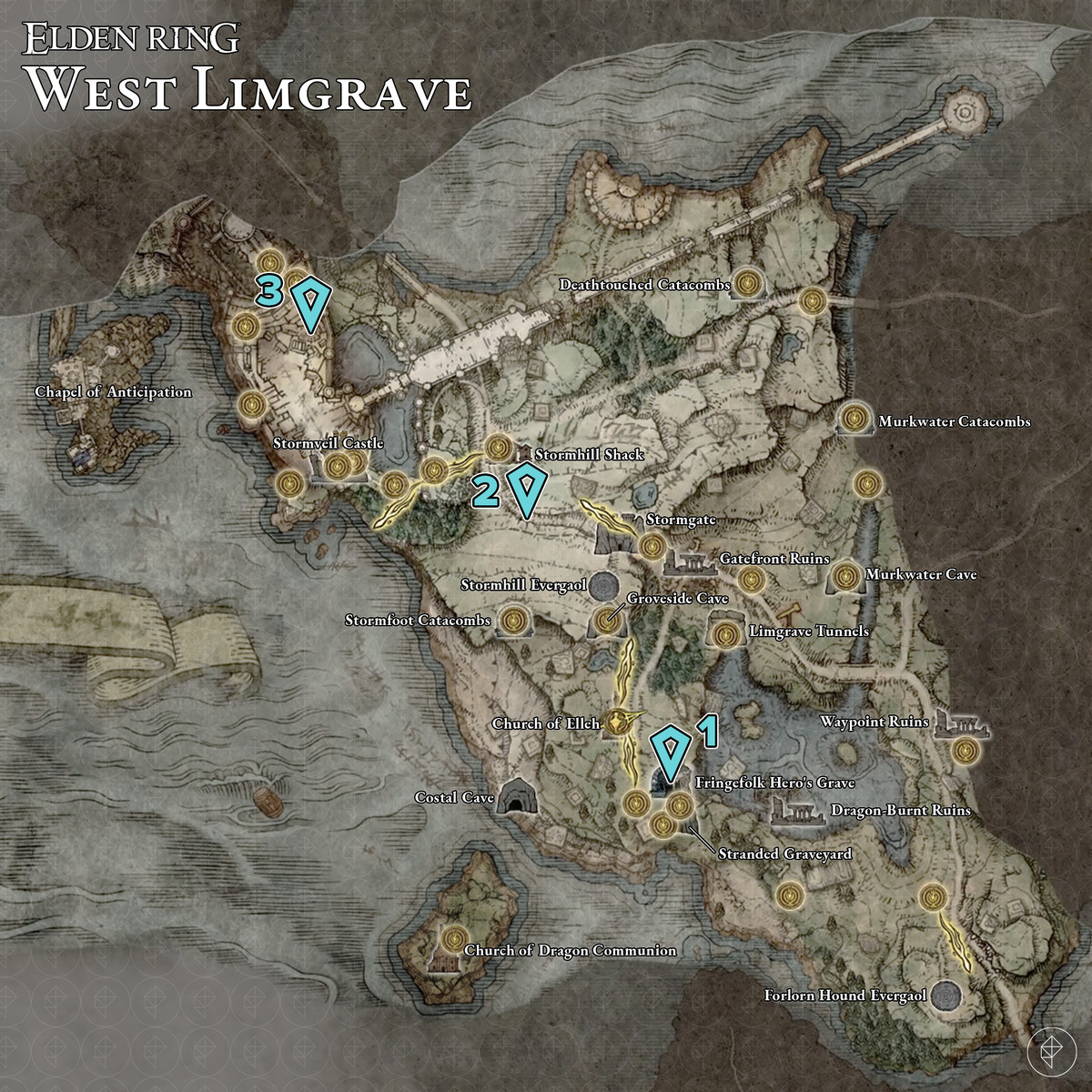 West Limgrave 지역에서 사용할 수 있는 Golden Seeds 3개(또는 4개)가 있습니다. 지도에 포함하지 않을 첫 번째 항목은 캐릭터 생성 시 기념품으로 사용할 수 있습니다 . 나머지는 프린지포크 영웅의 동굴(1) , 스톰게이트(2)  스톰베일 성 내부 은혜 의 외딴 감방(3) 내부 또는 근처에 있습니다 .