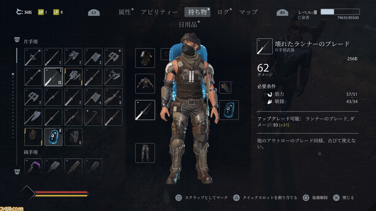 “장검”을 장비하기 위해서는 “근력”과 “민첩”이 일정수 필요라고 썼습니다만, 대장장이 어빌리티의 습득에는 한층 더 “체격”이 필요. 이것들을 정리하면, “근력”, “민첩”, “체격”이 모두 일정한 수치를 넘고 있어 트레이너를 찾아, LP와 일렉시트를 소비해 대장장이 어빌리티를 습득. 그 위에서 대장장이를 찾아내, “장검”의 재료가 되는 “깨진 장검”을 복수 입수해 처음으로, “장검의 장비”라고 하는 목표는 달성할 수 있는 것입니다.