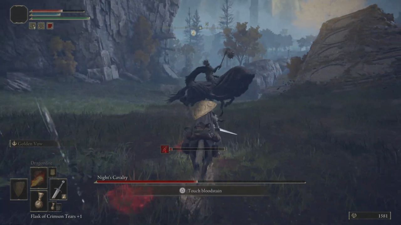 밤의 기병대를 만나면 믿을 수 있는 말 Torrent를 타고 이 보스와 싸워야 합니다. 이것은 게임의 맨 처음부터 Tree Sentinel 과 매우 유사하게 느껴져야 하는 선택적 보스 싸움입니다 . Night's Cavalry는 도보로 상대할 수 있지만 속도 면에서는 불리합니다.