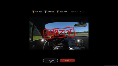 그렇다고는 해도 최초의 플레이에서는 코스도 모르고… 당초 간단하게 보였는데 다른 차를 피할 필요가 있거나, 풀 어시스트 상태라고 해도 코스를 모르는 것은 치명상이었습니다… 제대로 레코드 라인을 확보해 달리지 않으면 종반 타임 아웃이 되어 버립니다. 즉시 리트라이를 선택하고 다음은 노리노리로 골 수있었습니다!