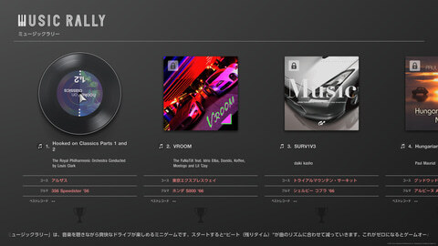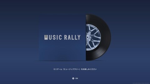 게임 인스톨 직후로부터의 흐름입니다만, 디스플레이나 콘트롤러의 설정을 행한 후, 갑자기 이번 작품보다 새롭게 더해진 미니 게임 「뮤직 랠리」의 체험으로 시작됩니다. 이 모드는 개발자의 야마우치 이치노리씨 강추의 게임 모드가 되어 있어, “놀라운 음악을 BGM에 레이스를 계속해, 주행할 수 있었던 거리에 따라 금, 은, 구리의 프라이즈가 증정된다”라고 하는 것 됩니다.
