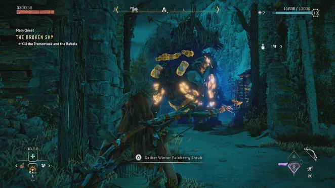 우리가 풀 수 있는 여러 통나무/돌 더미를 포함하여 지역 주변에 몇 가지 환경 함정이 있습니다. 따라서 Tremortusk를 이것들 가까이에 끌어다 놓고 그 위에 통나무를 떨어뜨려 피해를 입히십시오. 또한, 폐허 앞 근처에 죽은 Frost Bellowback이 있습니다. 우리가 이것을 Tremortusk 가까이에서 날려 버릴 수 있다면 그것은 또한 큰 피해를 입힐 것입니다. 그 외에는 빛나는 노란색 비트를 대상으로 하고 체력이 다 떨어질 때까지 구성 요소를 계속 두드립니다.