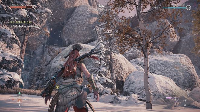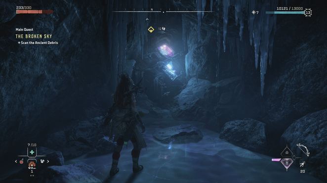 불행히도, 암석이 간섭을 일으키기 때문에 제대로 스캔하려면 파편에 더 가까이 다가가야 합니다. 따라서 우리는 위로 올라가야 합니다. 엘리베이터 동쪽과 고대 잔해에서 조금 더 떨어진 절벽을 오를 수 있는 부분을 찾으십시오. 여기에 얼어붙은 폭포가 있습니다.