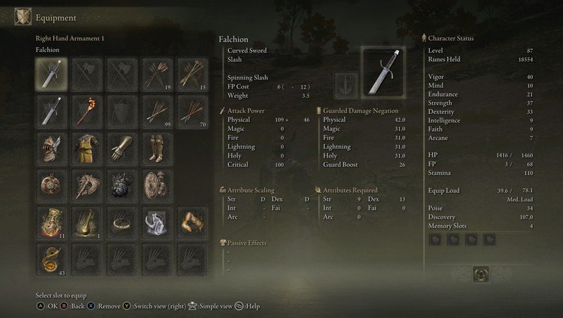 Elden Ring 의 파워 스탠스는 Dark Souls 2와 거의 동일하게 작동합니다. 파워 스탠스를 하려면 캐릭터의 손에 같은 유형의 무기를 장착하기만 하면 됩니다. 예를 들어 위의 내 장비 화면의 스크린샷에서 저는 각 손에 팔키온을 장착했습니다. Dark Souls 2에서 플레이어가 동일한 무기 두 개를 쌍수 휘두를 때 표준 자세와 파워 자세 기술 간에 전환할 수 있었던 것과 달리 Elden Ring은 이렇게 하면 자동으로 파워 자세 기술로 전환합니다.