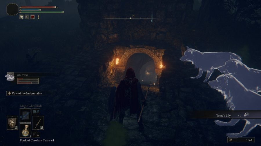 Graven-School Talisman - 마법의 위력을 높입니다. Red Wolf of Radagon 앞에 숨겨진 입구가 있습니다. 보스 투기장의 왼쪽에 있는 벽을 보면 어느 쪽을 공격해야 하는지 알려주는 메시지가 있을 것입니다.