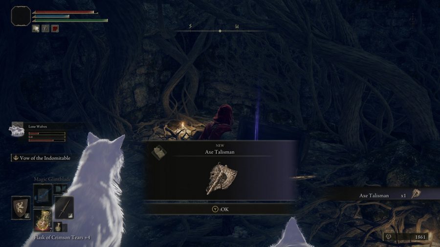 Axe Talisman – 돌진 공격을 강화합니다. East Limgrave의 Mistwood 유적 아래.