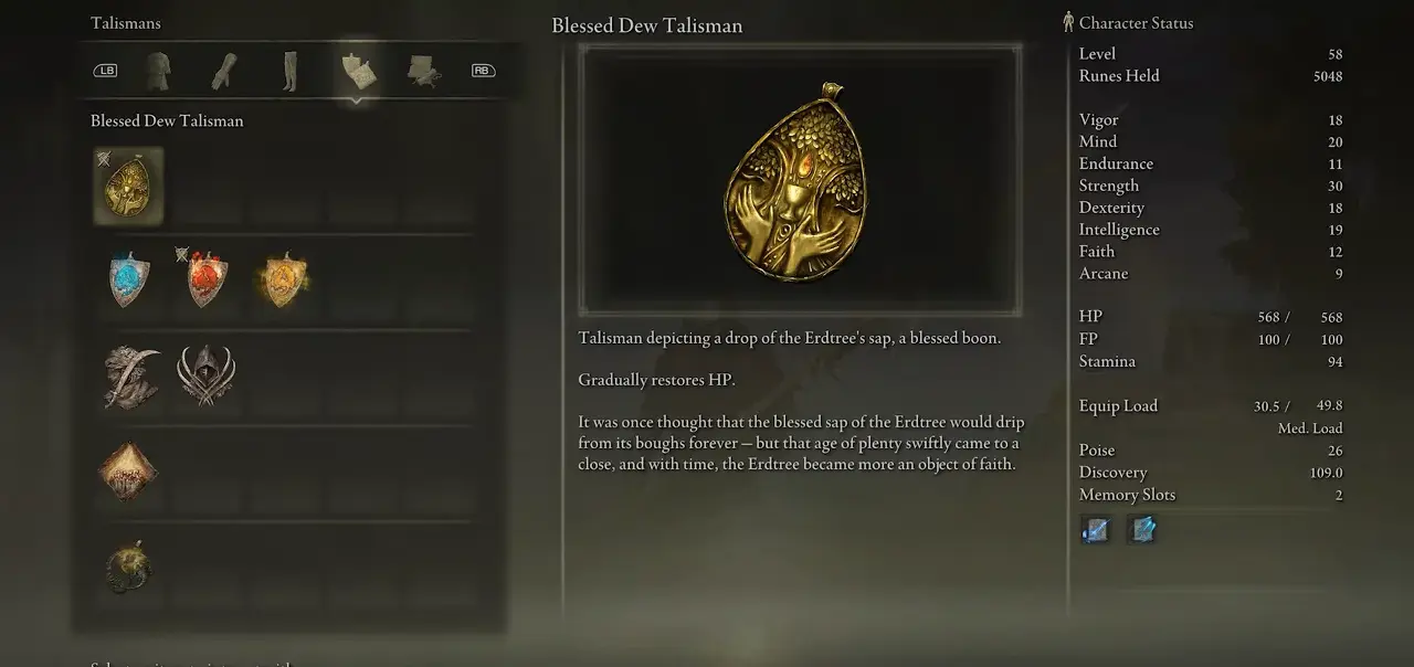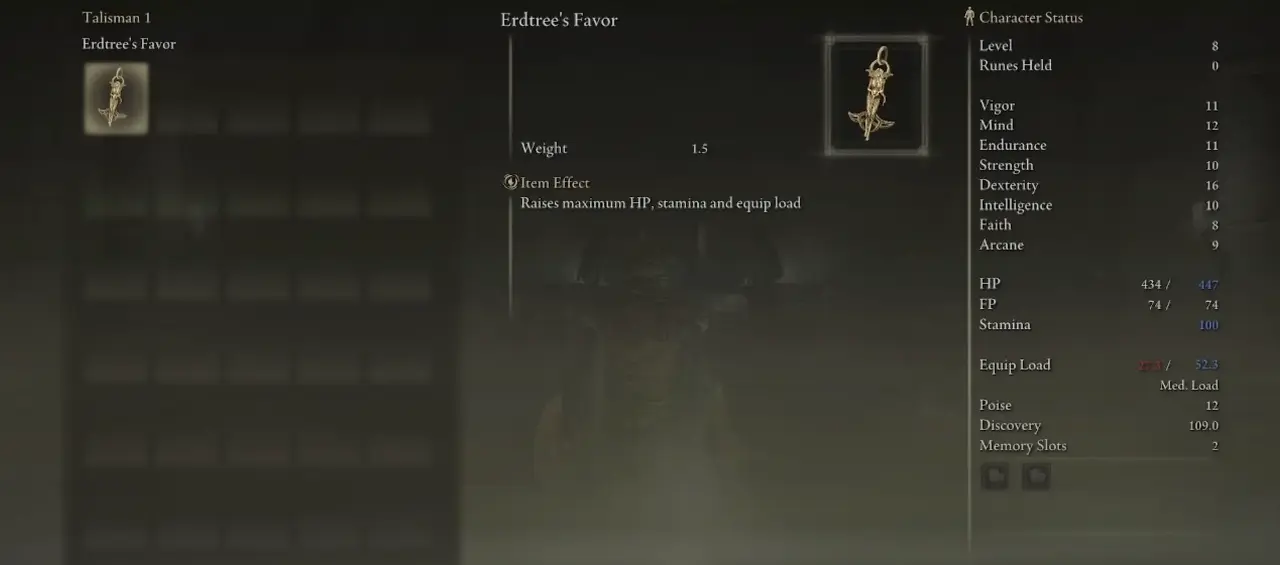 Erdtree's Favor Talisman은 많은 통계 버프를 줄 수 있습니다. HP와 스태미나를 증가시킬 수 있습니다. 앞에서 설명한 것처럼 전투 중에 구르는 경향이 있는 경우 증가된 스태미나가 도움이 될 것입니다. 높은 HP는 당신을 강력하게 만들고 많은 보스 전투에서 당신을 더 오래 살아남게 할 것입니다. 따라서 Erdtree의 부적은 당신에게 많은 도움이 될 수 있는 필수 아이템입니다.