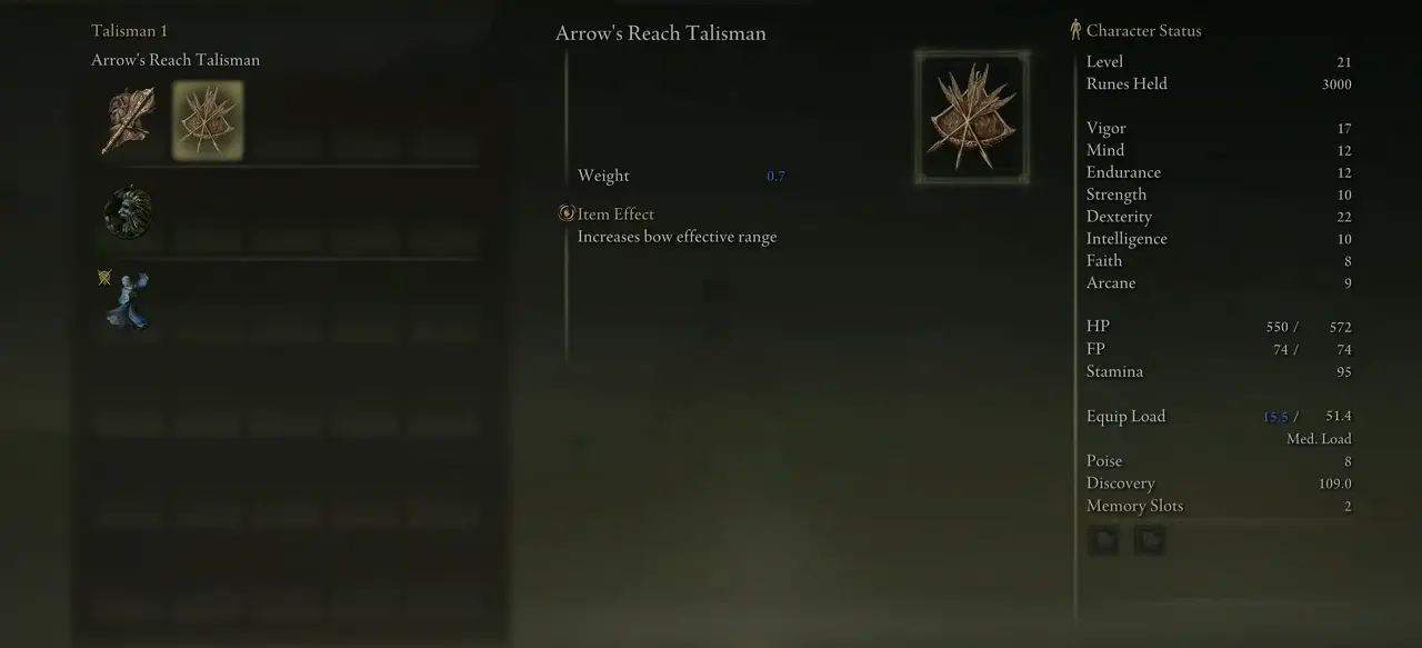 특히 활을 무기로 사용하는 경우 Arrow's Reach Talisman을 얻는 것이 좋습니다. 이 Eldein Ring Talisman은 활 공격의 범위를 증가시킵니다. Arrow's Reach Talisman은 멀리서 많은 적을 공격하는 데 도움이 될 수 있습니다. 따라서 Arrow's Reach Talisman을 사용하면 오픈 월드에서 많은 적을 쉽게 쓰러뜨리면서 탐색을 더 쉽게 할 수 있습니다. Arrow's Reach Talisman은 활을 주무기로 사용한다면 최고의 Elden Ring Talisman 중 하나입니다.