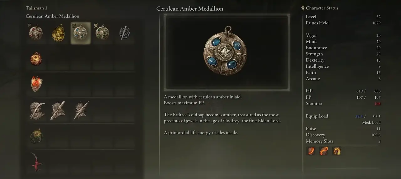 Cerulean Amber Medallion은 Fp를 높여 더 많은 마법 공격과 영혼 소환을 가능하게 합니다. 더 많은 마법 공격을 사용하는 클래스를 사용하는 경우 세룰리언 앰버 메달리온을 사용하는 것이 좋습니다. 그것은 보스와 어려운 적에 대해 더 빨리 Fp가 부족해지는 것을 방지할 것입니다. 특히 마법 클래스를 사용하는 경우 Elden 링에서 가장 좋은 부적 중 하나입니다 .
