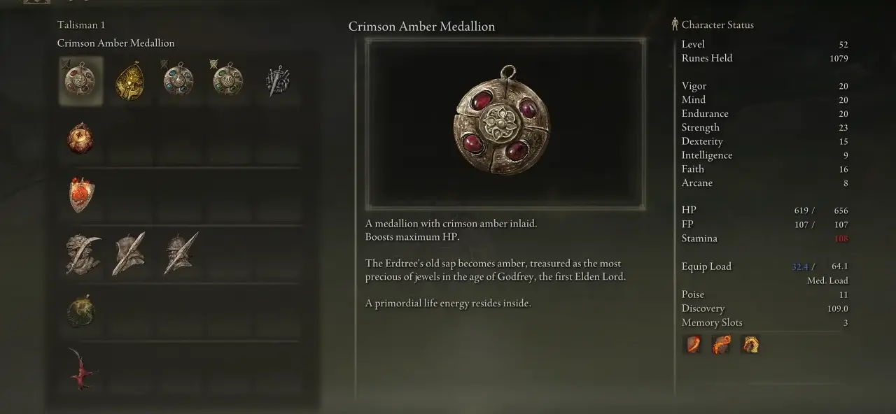 진홍색 호박 메달을 기념품으로 선택하면 게임 시작 시 획득할 수 있습니다. 초반에 놓쳤다면 림그레이브 남부의 몬 성벽 근처에서 얻을 수 있다. 그런 다음 울고있는 반도로 가면 상인에게서 약 1500 룬에 Crimson Amber Medallion을 얻을 수 있습니다.