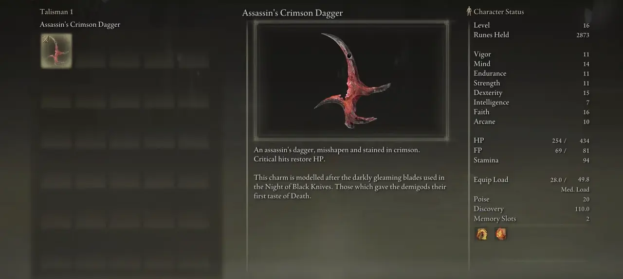 Assassin's Crimson Dagger는 모든 치명타로 HP를 크게 회복할 수 있습니다. 치유력으로 인해 최고의 엘든 링 부적 중 하나로 간주됩니다. Assassin's Crimson Dagger는 치명타를 많이 얻으면 보스전에서 놀라운 효과를 발휘합니다. 특히 전투 중 많은 치유량이 필요한 경우 Assassin's Crimson Dagger Talisman을 장착하는 것이 좋습니다. Assassin's Crimson Dagger는 근접 빌드에 도움이 될 수 있습니다.