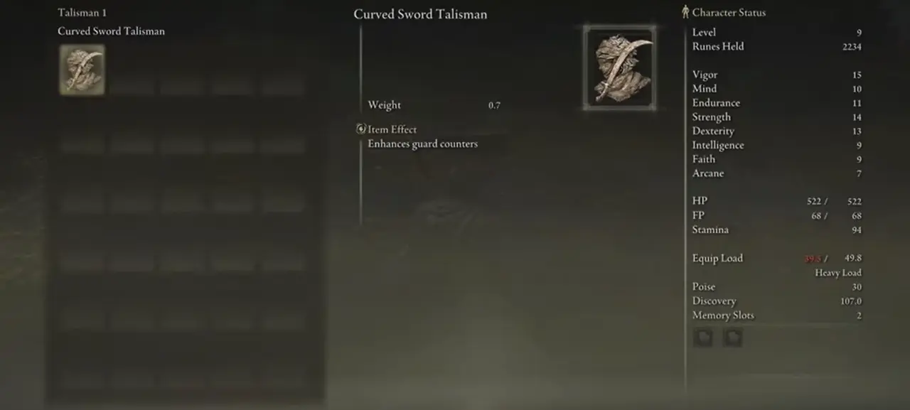 Curved Sword Talisman은 마지막 최고의 Elden Ring Talisman 입니다 . 이것은 가드 카운터를 향상시킬 수 있습니다. 가드 카운터는 공격을 방어한 후 적을 공격하는 독특한 방법입니다. 당신의 캐릭터는 큰 피해를 줄 수 있습니다. 또한 가드 카운터로 상대의 스탠스를 깨뜨릴 수도 있습니다. 곡검 부적은 가드 카운터의 잠재력을 훨씬 더 높일 수 있기 때문에 훌륭한 부적입니다.