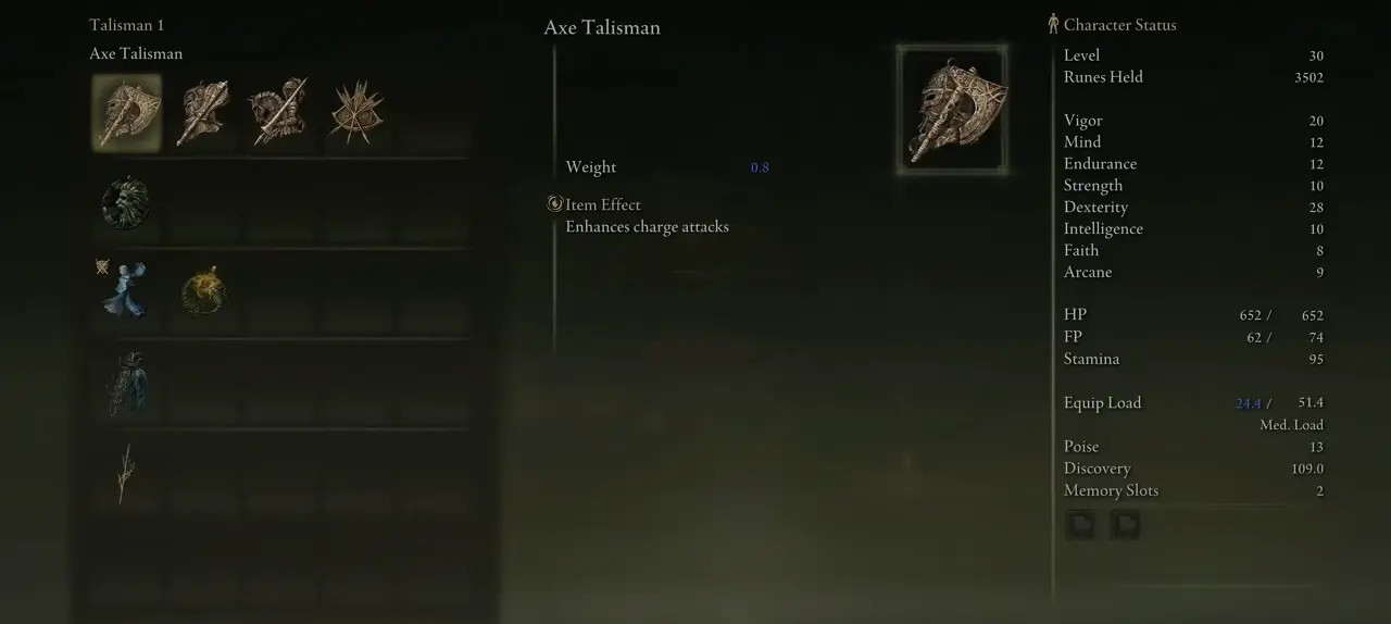 Axe Talisman은 캐릭터가 여러 적에게 강력한 펀치를 날릴 수 있도록 도와줍니다. 보스와 일반 적 모두에게 치명적일 수 있는 차지 공격 데미지를 크게 증가시킵니다. 좋은 공격 부스트를 원한다면 이 Talisman In Elden Ring을 장착하는 것이 좋습니다. Axe Talisman을 사용하면 적은 노력으로 큰 피해를 줄 수 있습니다.