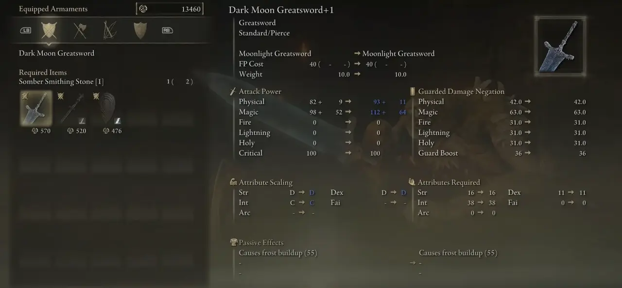 Legendary Moonlight Greatsword는 82의 큰 기본 물리 피해를 가지고 있습니다. 또한 좋은 범위에서 적에게 마법 피해를 줄 수 있습니다. 무기는 지능, 손재주 및 힘에 따라 확장됩니다. 게다가 100의 높은 크리티컬을 가진 이 검으로 많은 크리티컬 공격을 할 수 있습니다. 월광 대검을 양손으로 사용하면 상당한 데미지를 줄 수 있습니다 .