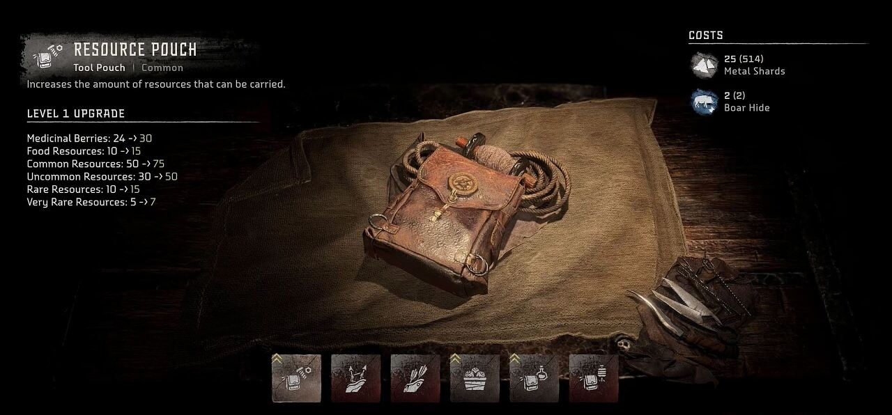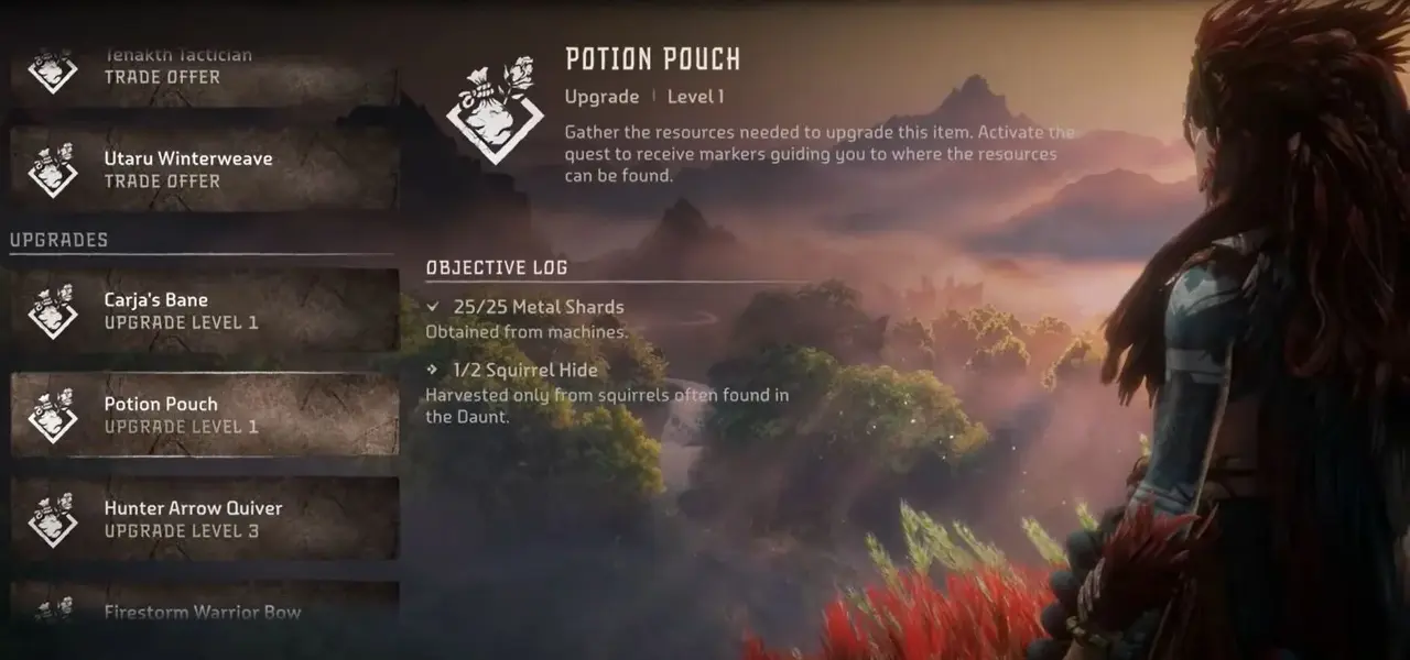 Horizon Forbidden West 파우치는 확실히 다양합니다. 그러나 각 품목에 대한 다양한 파우치에도 불구하고 결국에는 공간이 부족하게 됩니다. 그리고 그렇게 할 때 주머니를 업그레이드해야 합니다. 운 좋게도 이번에 파우치를 업그레이드하는 것은 전편인 Horizon Zero Dawn만큼 시간이 걸리지 않습니다.